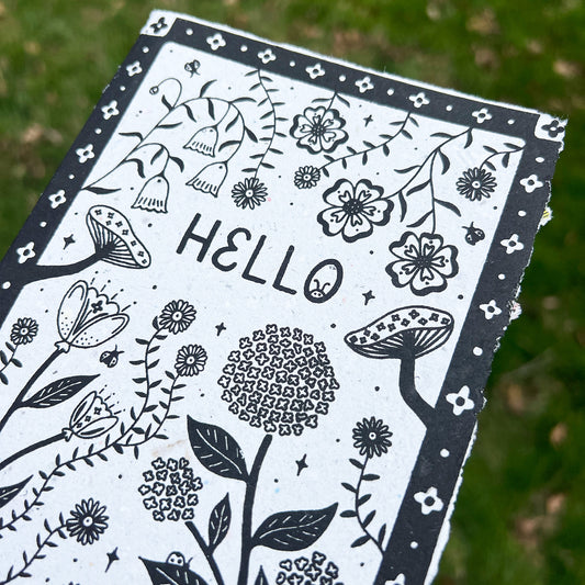 Each greeting card is hand-illustrated, screenprinted, and printed on paper I made myself from recycled junk mail. No two are alike — they're little pieces of art, ready to send some love.