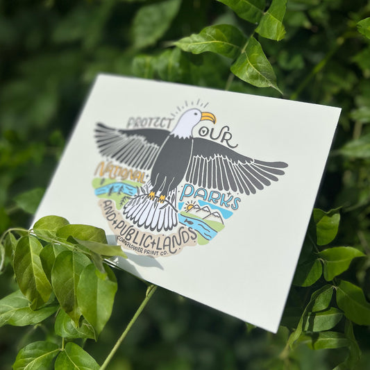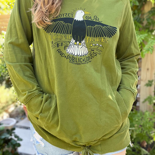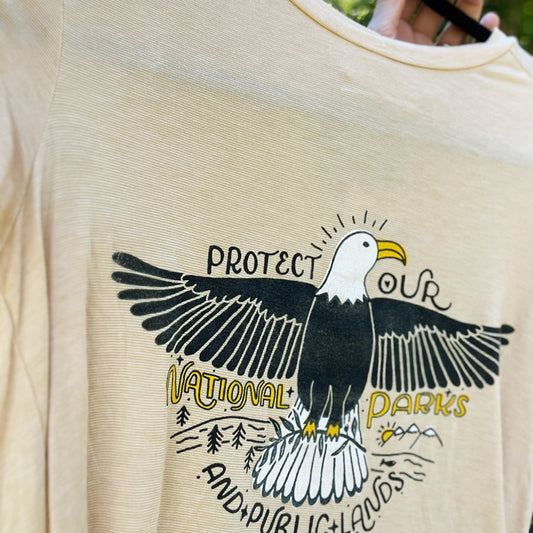I created this design as a love letter to our public lands—featuring a bold eagle and a message that says it all: Protect Our National Parks & Public Lands. I print each one by hand on thrifted apparel, so no two are the same. And to give back, I donate 10% of proceeds to the National Parks Conservation Association. 🦅🌲