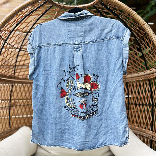 Seconds ✿ Self Care Cat | Blue Short Sleeve Button Up | Small