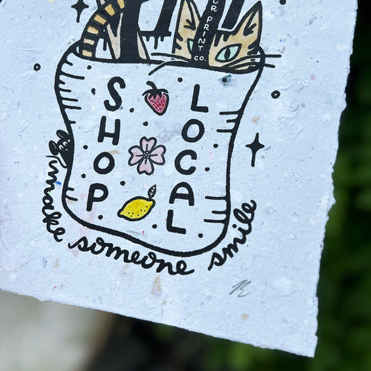 Screenprinted by hand on upcycled thrifted apparel, each piece is completely one-of-a-kind, keeping quality clothing in use and out of landfills. Wear it as a reminder to support small businesses, spread kindness, and express yourself through what you wear!
