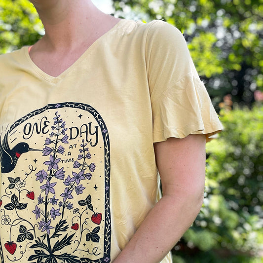 One Day at a Time | July Birth Flower | Yellow V-Neck Tee | XL