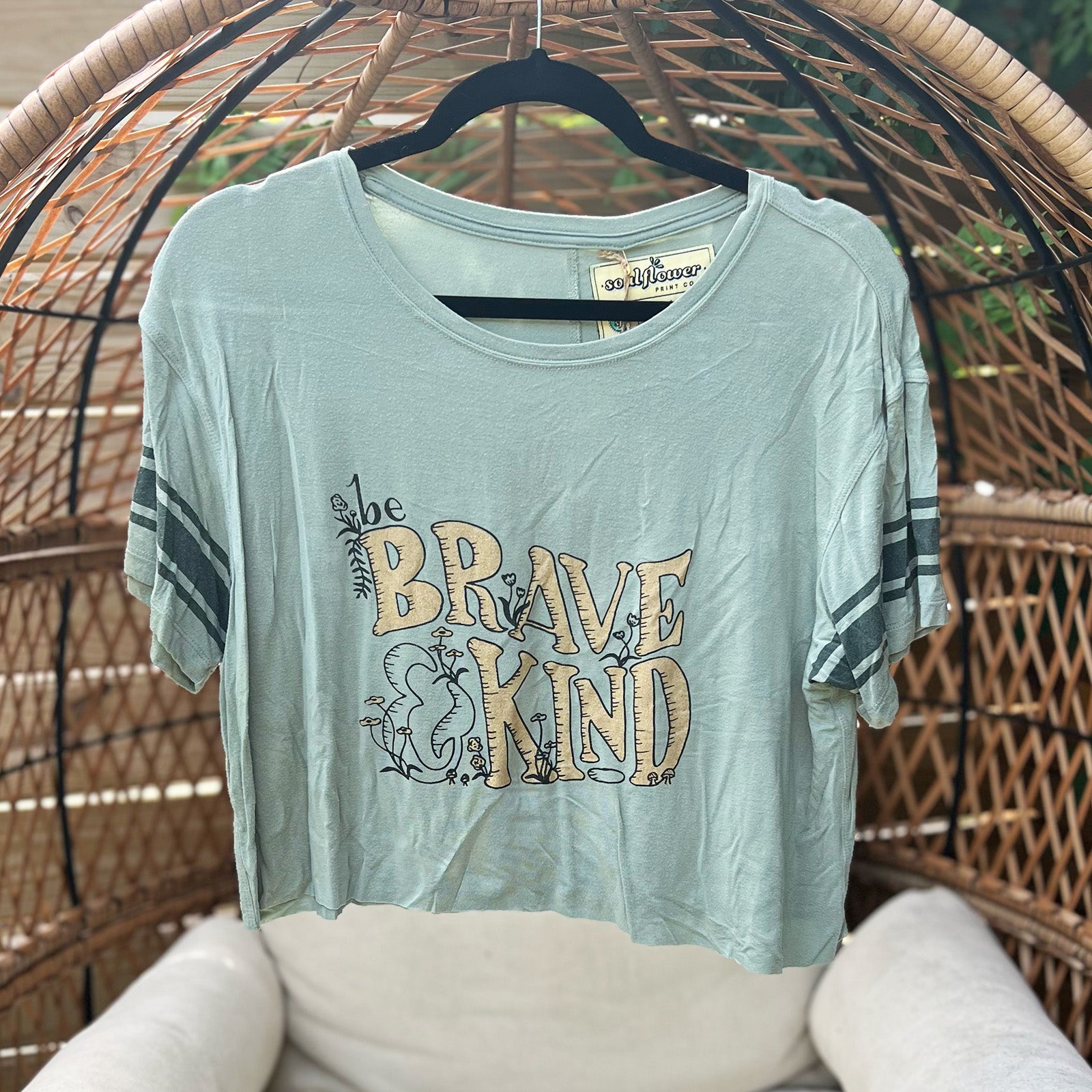 Our "Brave & Kind" vintage blue/green crop top is perfect for pairing with high-waisted jeans or a flowy skirt. Whether you're heading out for a casual day with friends or want to make a statement about who you are, this crop top is your go-to for showcasing both your strength and your softer side. Be brave, be kind, and wear it with pride!