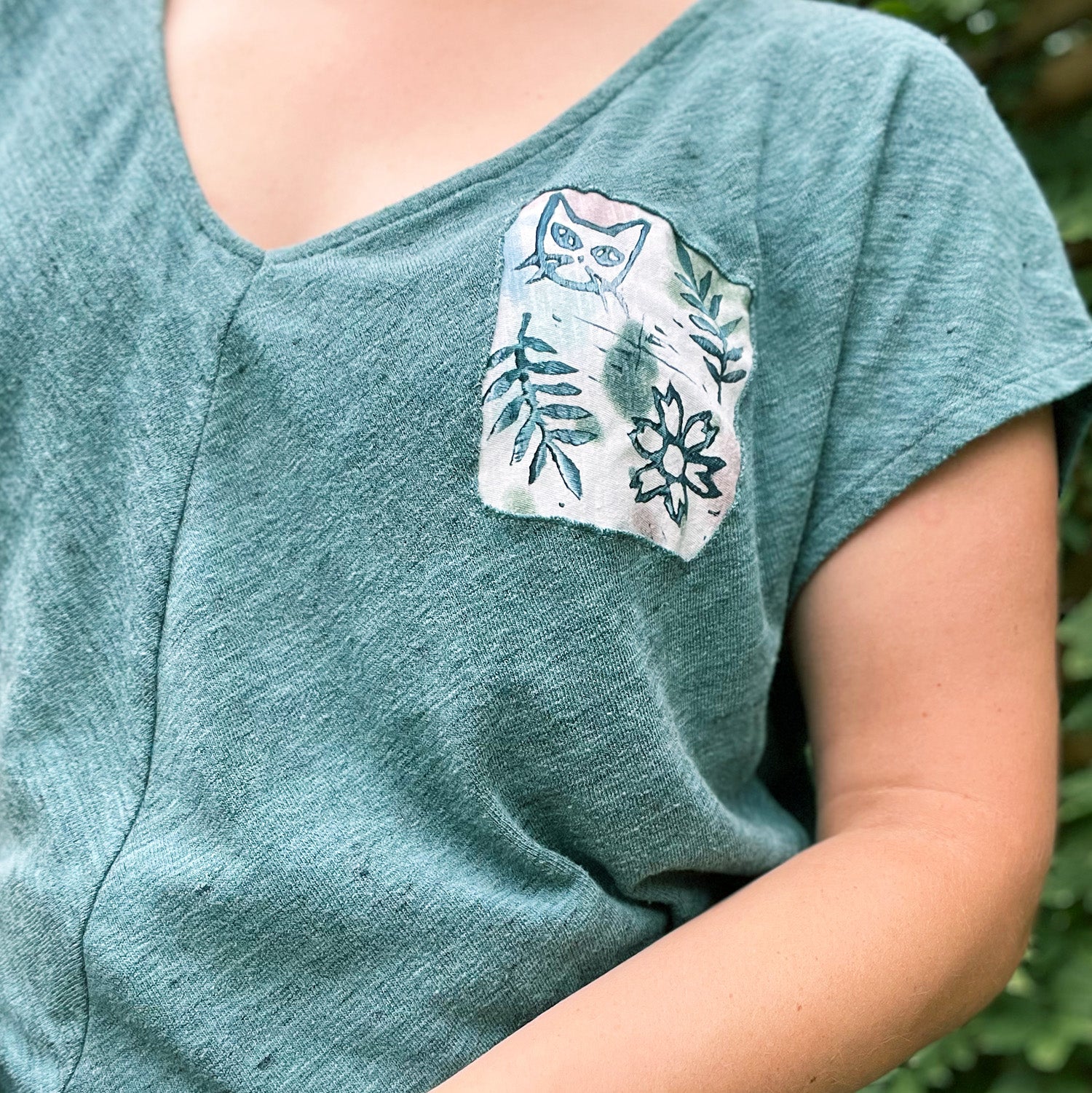 Cat & Leaf Block Print | Teal / Green Tee | Large