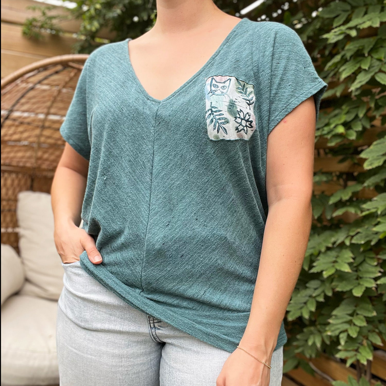 Beautiful heather teal raglan t-shirt with short sleeves featuring a custom printed block print patch on the front right pocket area. Back of the shirt is blank. The cat face, flower and leaf motifs are perfect for spring and summer.