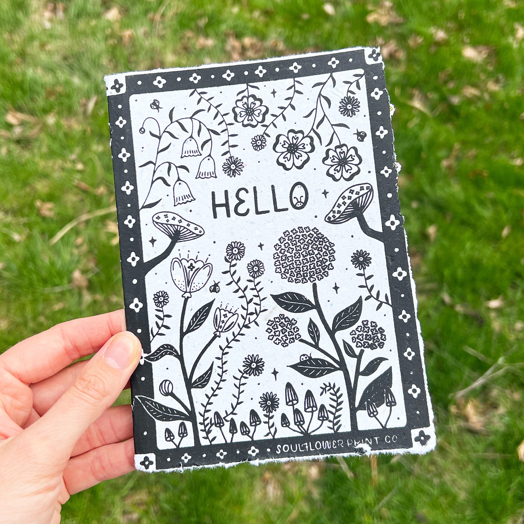 This handmade greeting card features my hand-illustrated “hello” design, surrounded by a little garden party of flowers (like hydrangeas and tulips), mushrooms, and tiny ladybugs—because who doesn’t love a cheerful bug moment? 🐞