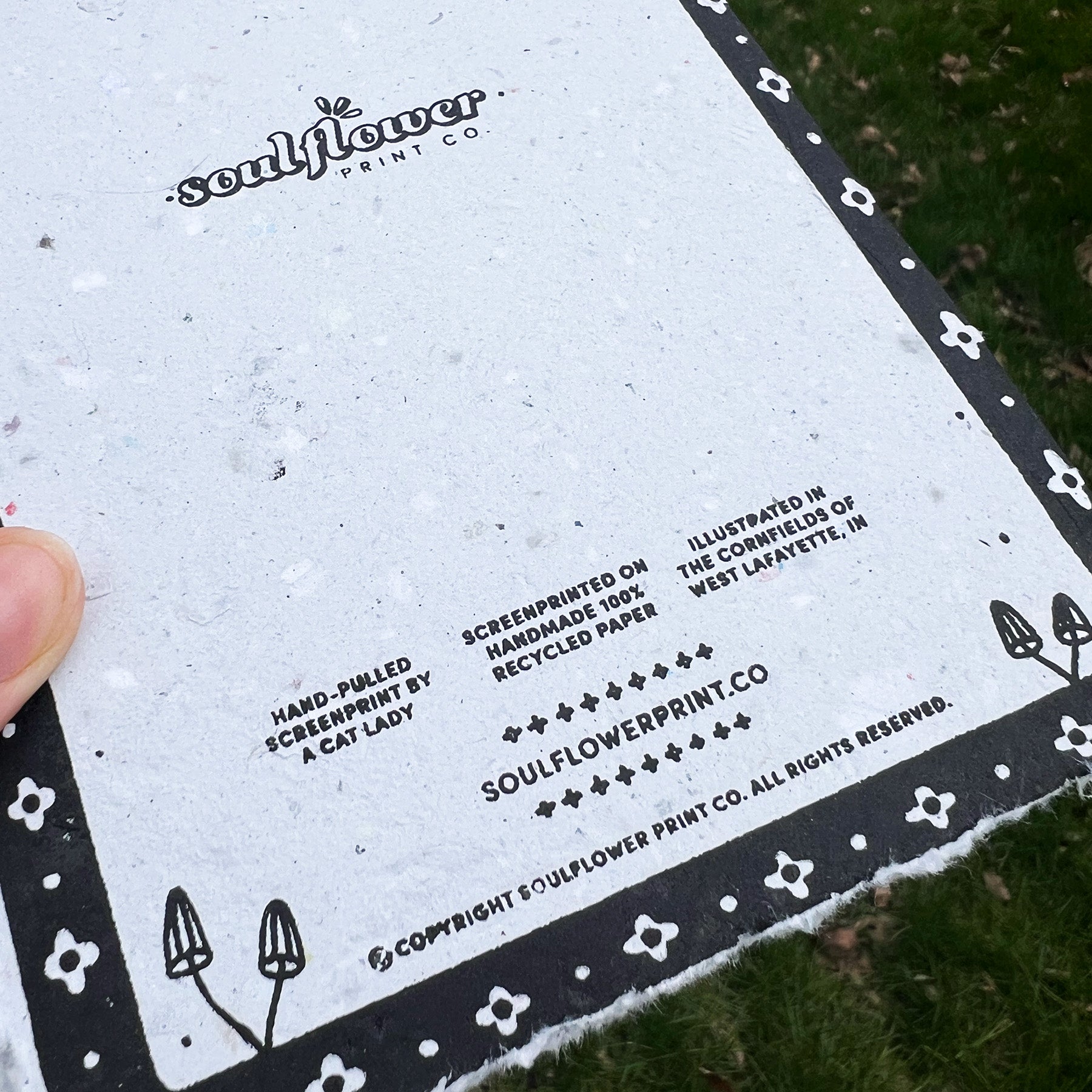 Please note: each card is one-of-a-kind — the handmade paper and hand-pulled screenprints may vary slightly from what you see on screen, with all the charming quirks and character that come from being made by real human hands.