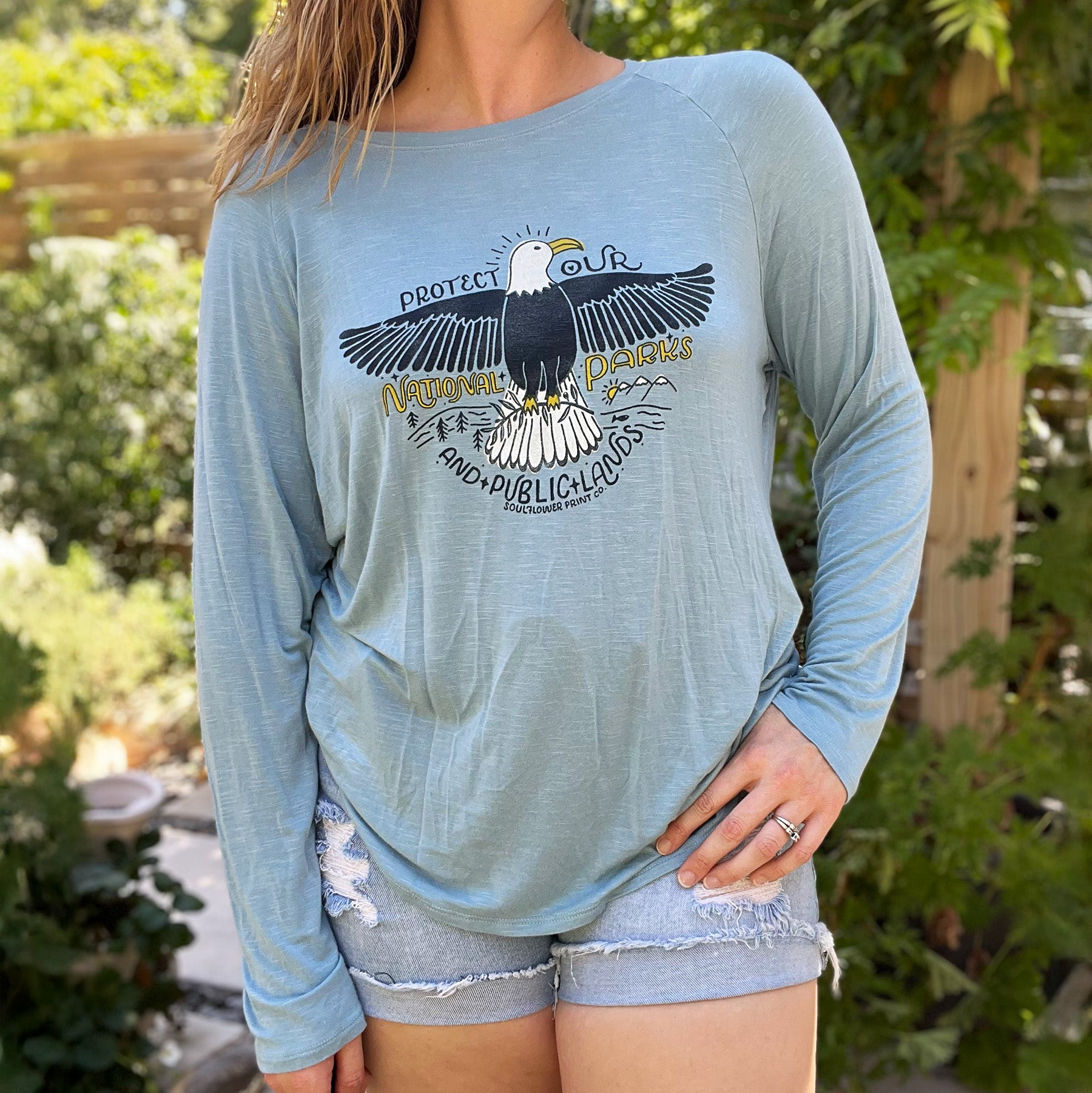 Show some love for the great outdoors with this one-of-a-kind upcycled shirt! Featuring a bold bald eagle with wings stretched wide, protecting a dreamy landscape of mountains, rivers, and open land. It's holding an olive branch as a symbol of peace, and the message says it all: "Protect Our National Parks & Public Lands."