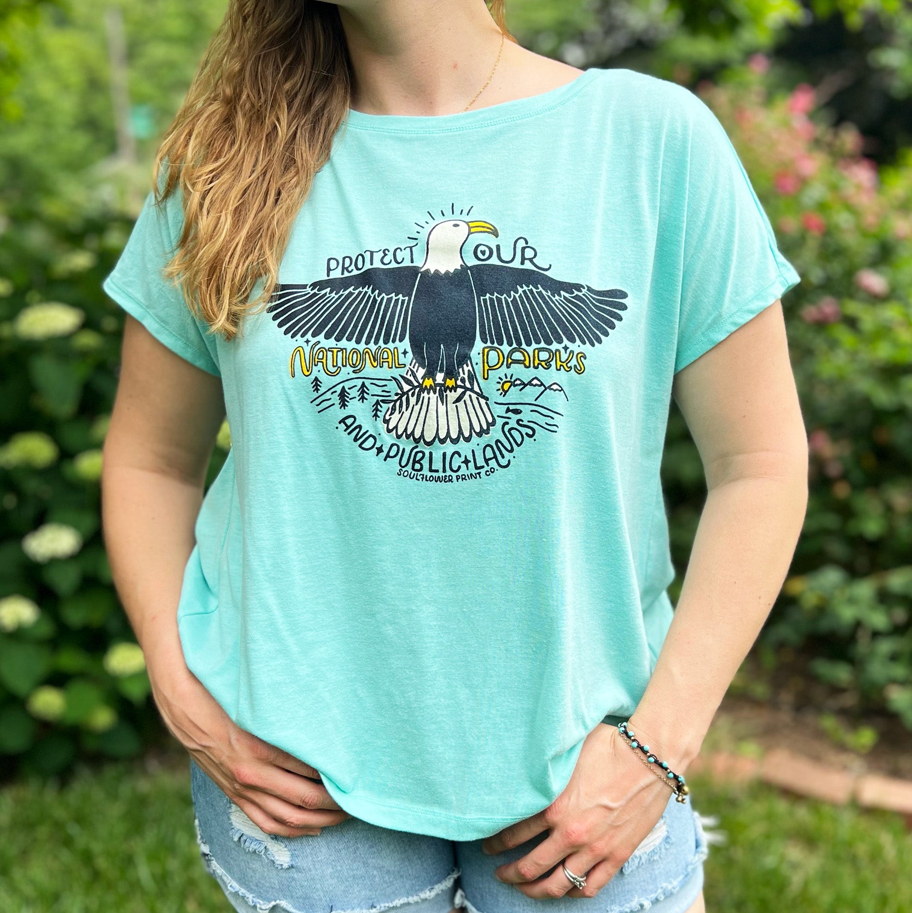 Show some love for the great outdoors with this one-of-a-kind upcycled tee! Featuring a bold bald eagle with wings stretched wide, protecting a dreamy landscape of mountains, rivers, and open land. It's holding an olive branch as a symbol of peace, and the message says it all: "Protect Our National Parks & Public Lands."