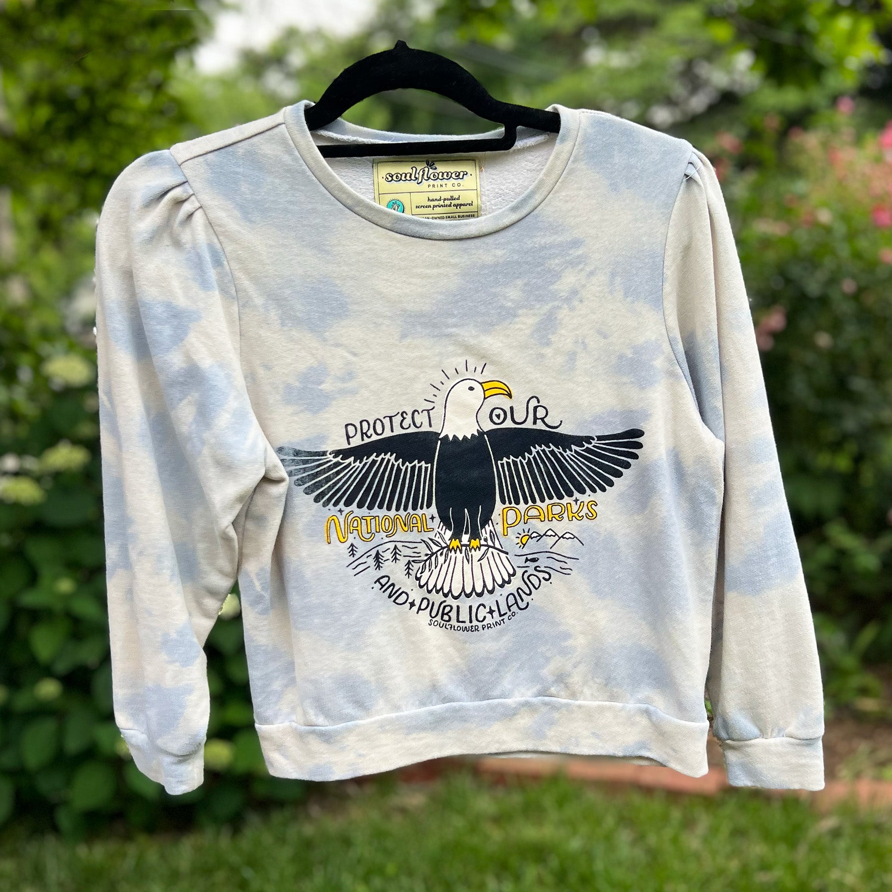 Show some love for the great outdoors with this one-of-a-kind upcycled sweatshirt with thumbholes! Featuring a bold bald eagle with wings stretched wide, protecting a dreamy landscape of mountains, rivers, and open land. It's holding an olive branch as a symbol of peace, and the message says it all: "Protect Our National Parks & Public Lands."