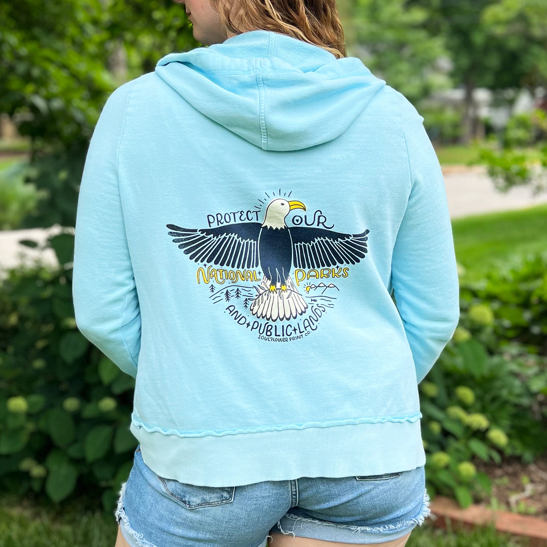 Show some love for the great outdoors with this one-of-a-kind upcycled zip-up jacket! Featuring a bold bald eagle with wings stretched wide, protecting a dreamy landscape of mountains, rivers, and open land. It's holding an olive branch as a symbol of peace, and the message says it all: "Protect Our National Parks & Public Lands."