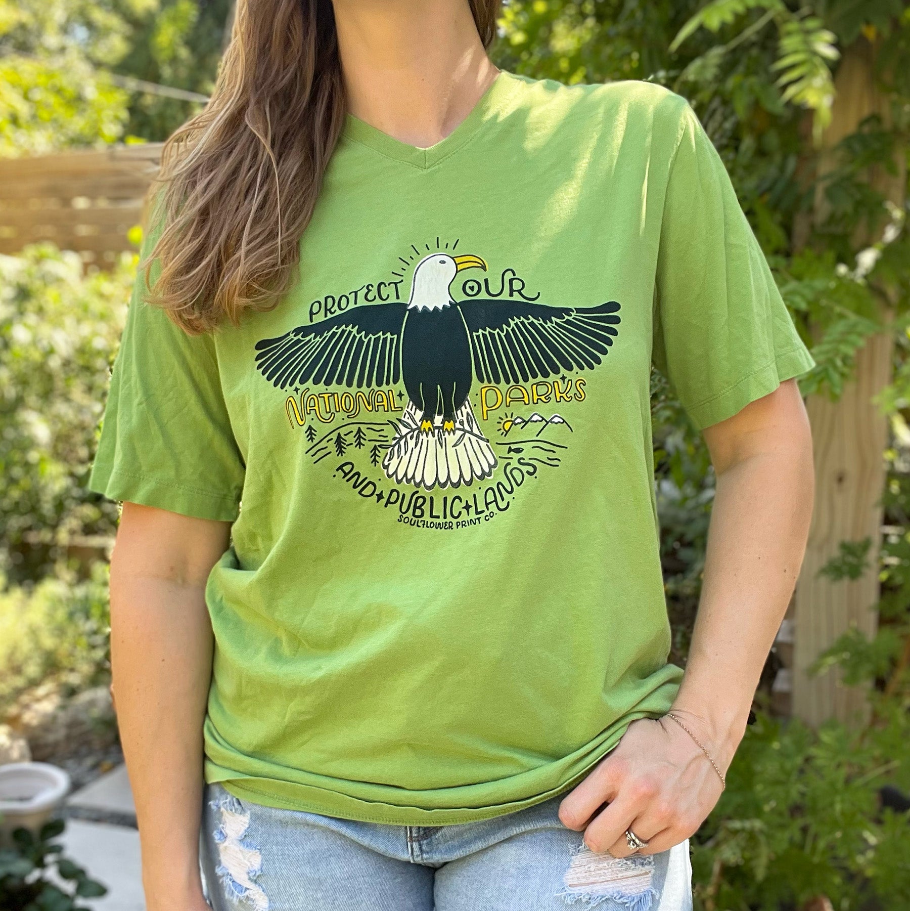 Show some love for the great outdoors with this one-of-a-kind upcycled shirt! Featuring a bold bald eagle with wings stretched wide, protecting a dreamy landscape of mountains, rivers, and open land. It's holding an olive branch as a symbol of peace, and the message says it all: "Protect Our National Parks & Public Lands."