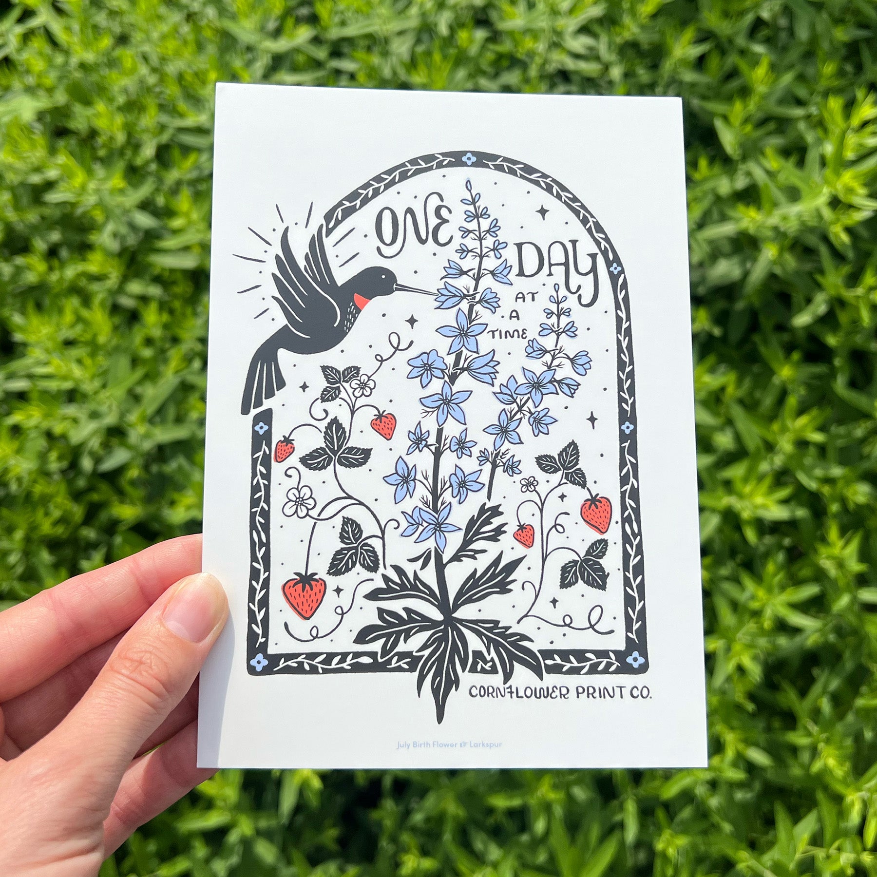 This one’s for the July babes (or anyone who needs a little reminder to slow down). Featuring vibrant larkspur, sweet strawberries, and a curious hummingbird, this postcard is a quiet nudge to take things one day at a time. Inspired by July’s birth flower, birth fruit, and ruby tones — it’s the perfect mix of calm and color.