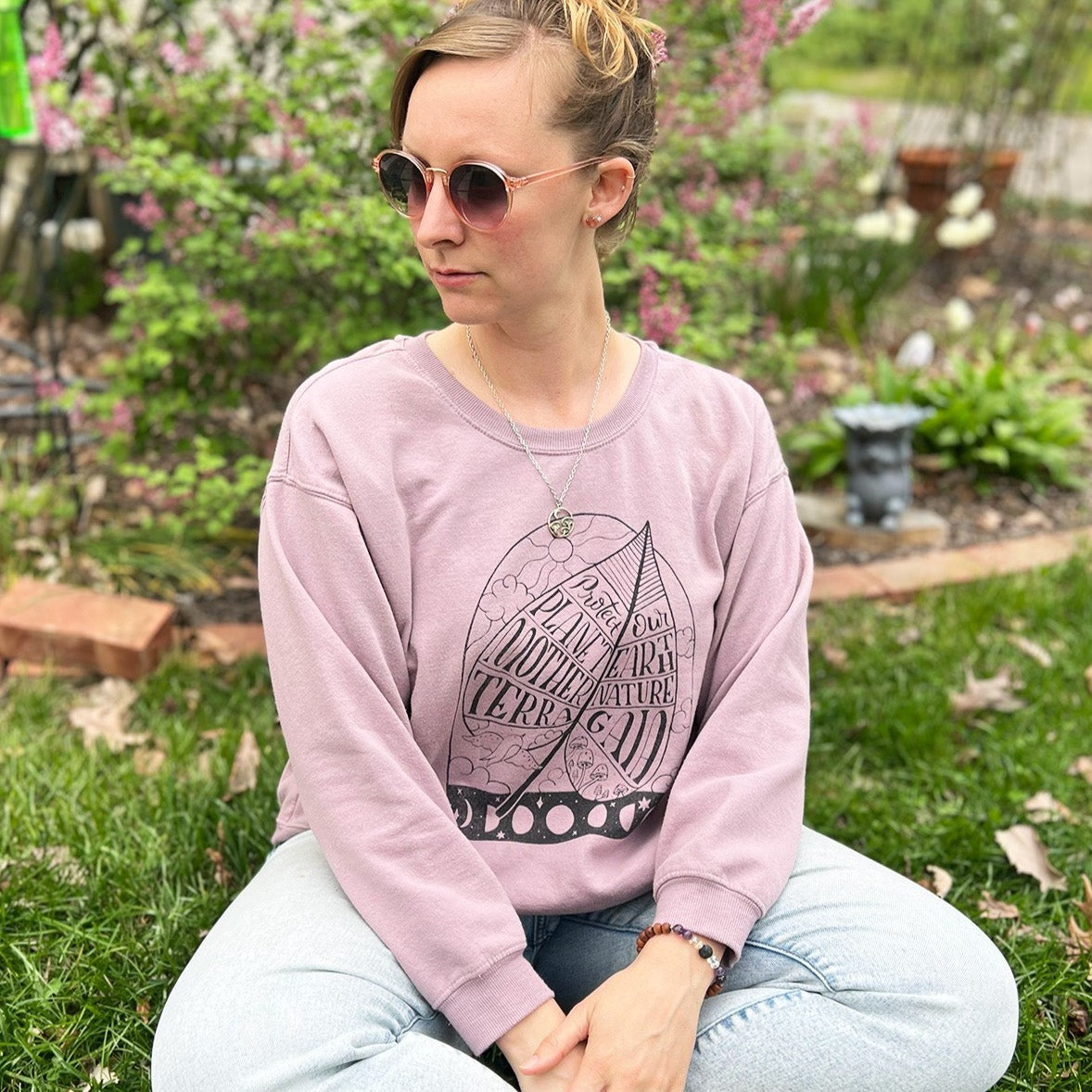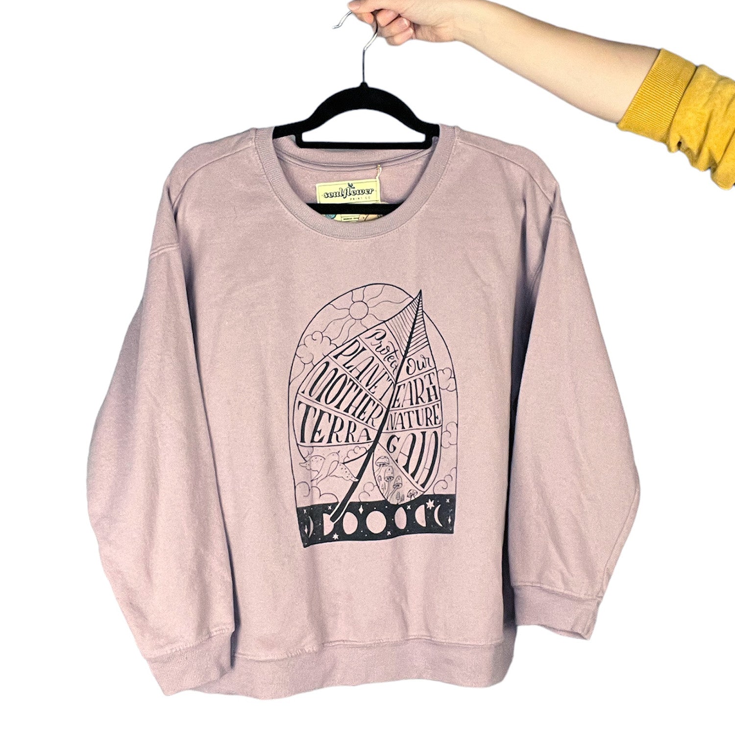 Light purple sweatshirt with 3/4 sleeve featuring a design promoting the protection of mother nature / our planet / earth. Back of the shirt is blank. 1-color screenprint featured on the front of the shirt.