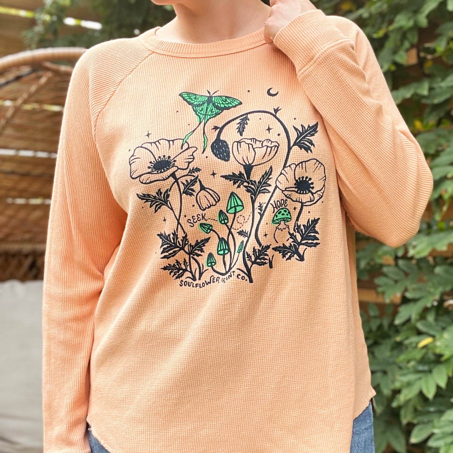 Introducing our "Seek Hope" design on a peachy orange waffle knit long sleeve shirt—your new go-to for comfort and inspiration. Featuring delicate motifs of a luna moth, vibrant poppies, and whimsical mushrooms, this design serves as a gentle reminder to always look for the light in the dark.