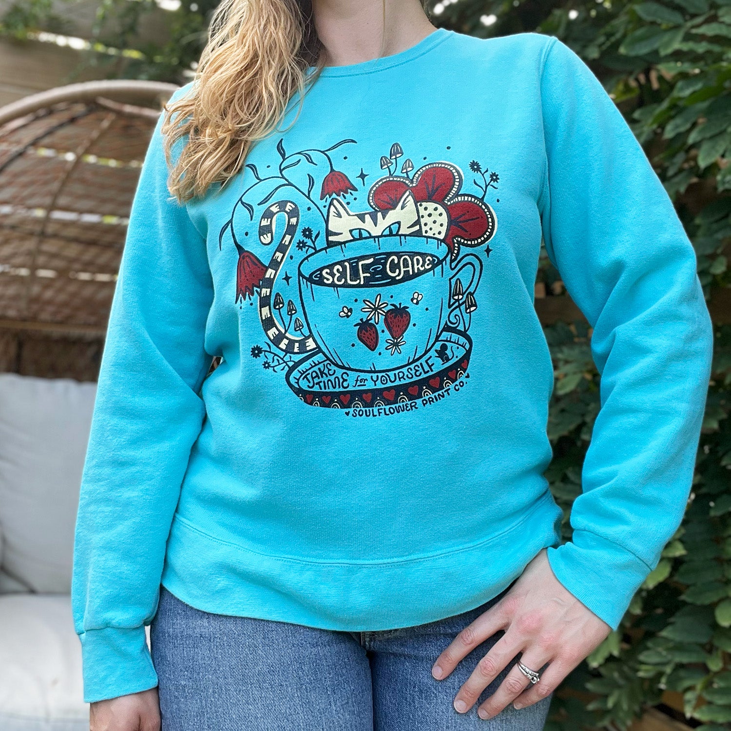 I bought a pink self care cat hoodie and it is so soft, comfy and cute! I did an exchange to size up and Jess was super helpful and patient as I was traveling. She also generously donated several Soulflower items to a local cat rescue art fund raiser. She’s not just a great artist but a kind person too!