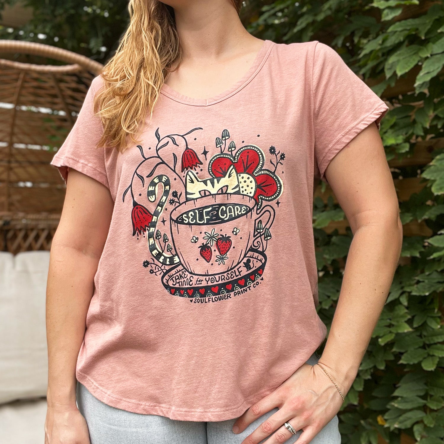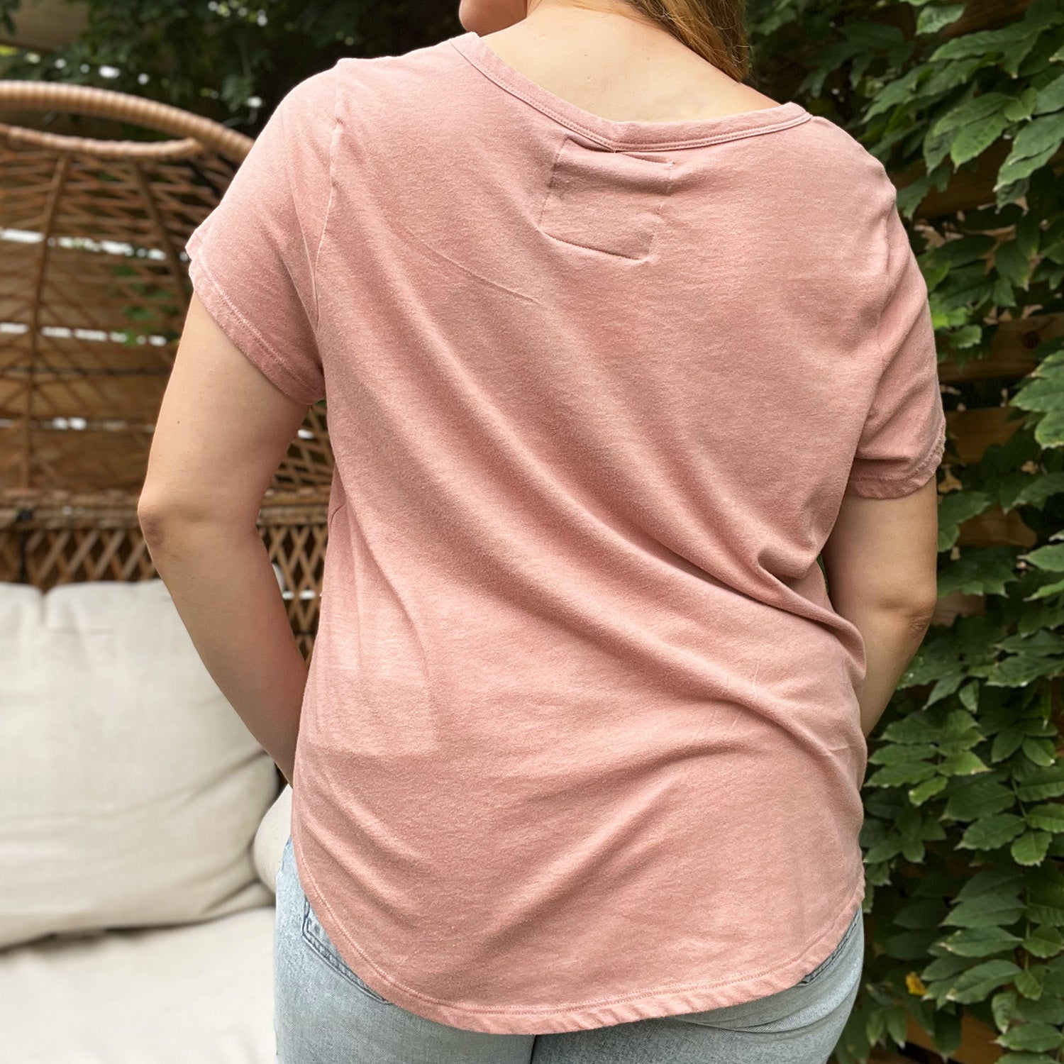 Soft dusty pink short sleeve shirt. 3-color screenprint featured on the front of the shirt. Back of the shirt is blank.