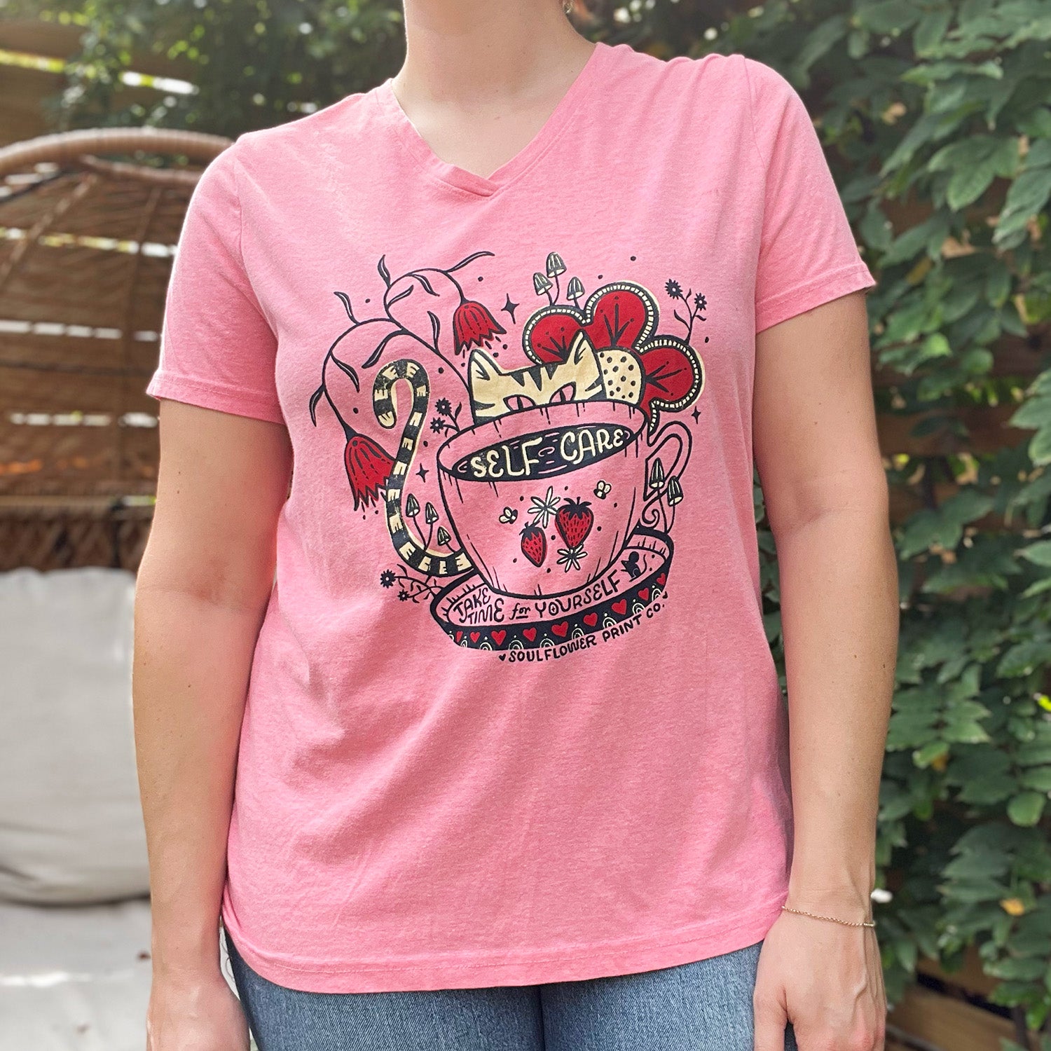 Super soft pink short sleeve shirt. 3-color screenprint featured on the front of the shirt. Back of the shirt is blank.
