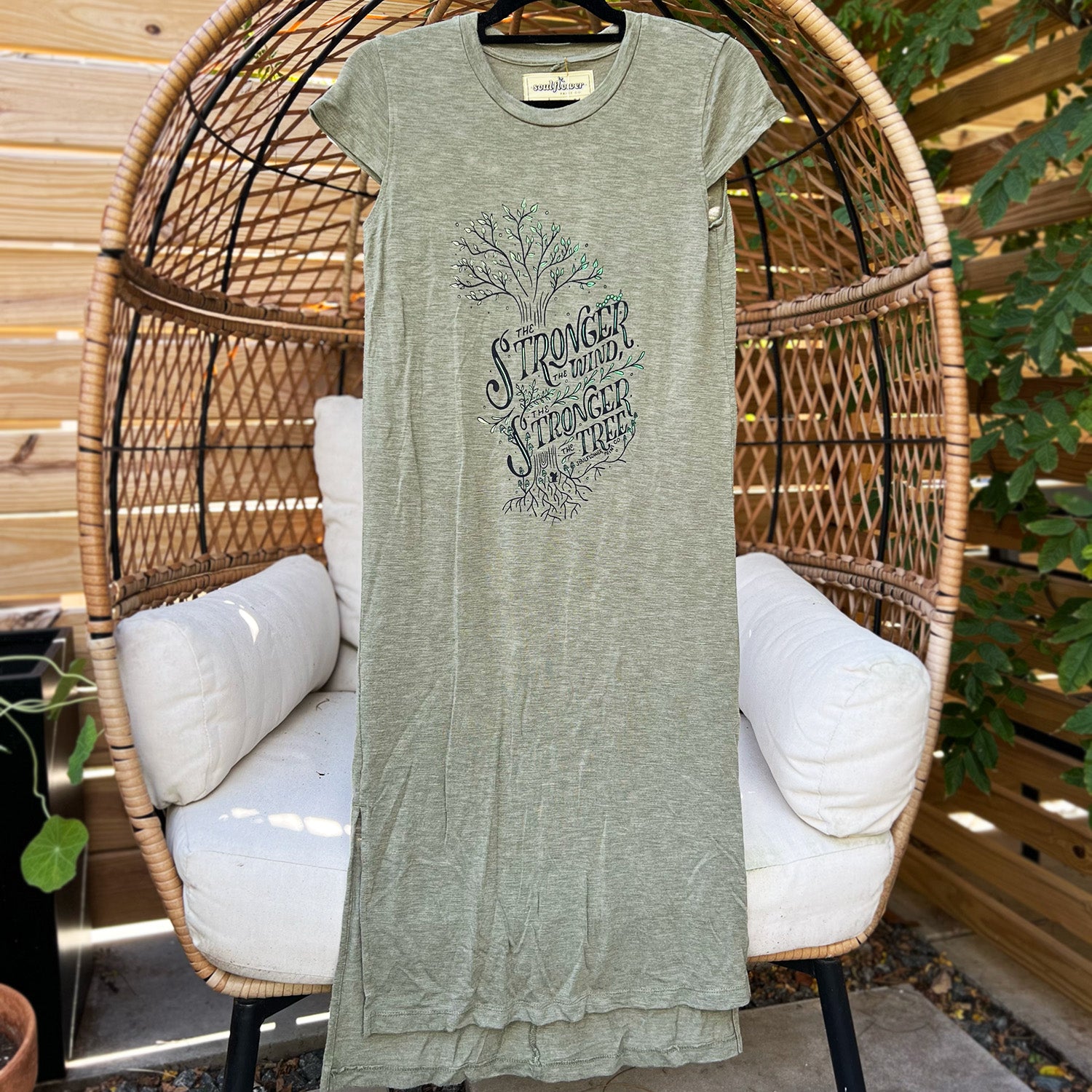 Introducing the Strong Tree design on a super cute olive green maxi dress with side slits! With gradient pink to yellow to green leaves, charming mushrooms 🍄, a little forest mouse nestled at the base, and a caterpillar crawling, this design is all about strength, growth, and staying grounded through life's challenges. The inspiring phrase "The Stronger the Wind, the Stronger the Tree" reminds you of your resilience, no matter what storms come your way. 🌿