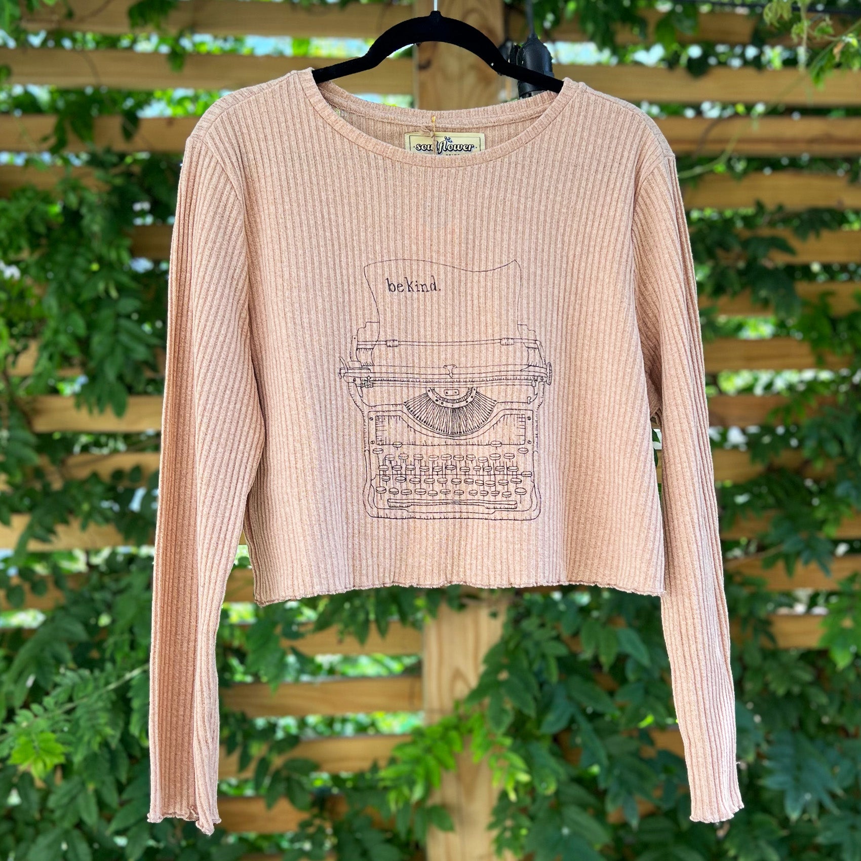 Spread a little kindness with our light brown / beige ribbed long sleeve crop top featuring the charming "Be Kind" typewriter design. This tee is a sweet, cozy reminder to lead with compassion every day. Perfect for pairing with jeans or layering under your favorite jacket, this t-shirt is more than just a fashion statement—it's a call to kindness.