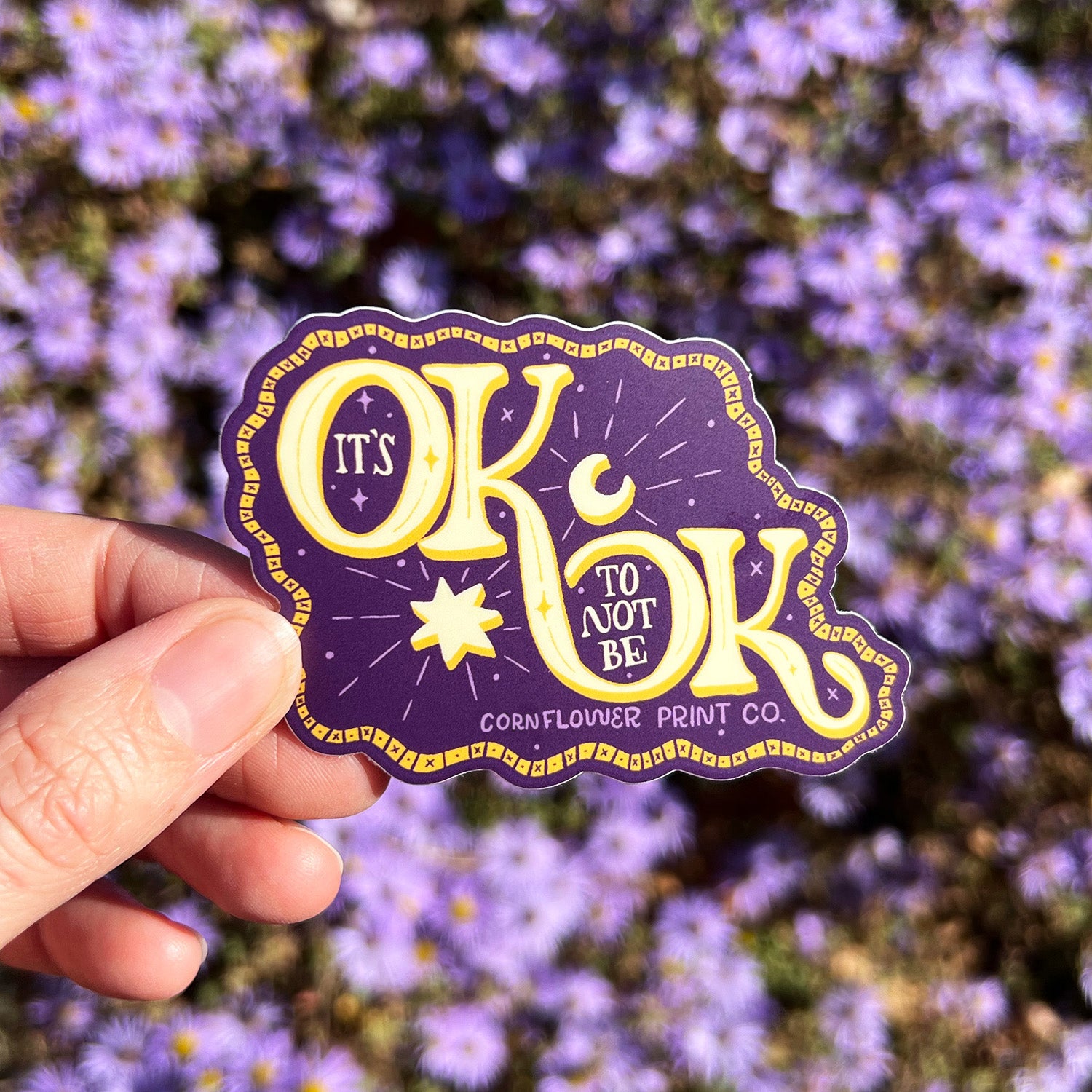 Our "It's Ok to Not Be Ok" vinyl sticker by Soulflower Print Co. is a gentle reminder for those tough days. Designed with a beautiful deep purple and gold color palette and a soothing moon and star motif, this sticker brings a touch of comfort and calm wherever you place it. Made from premium vinyl with a durable matte finish, it’s perfect for laptops, water bottles, journals, or anywhere you need a little reassurance.