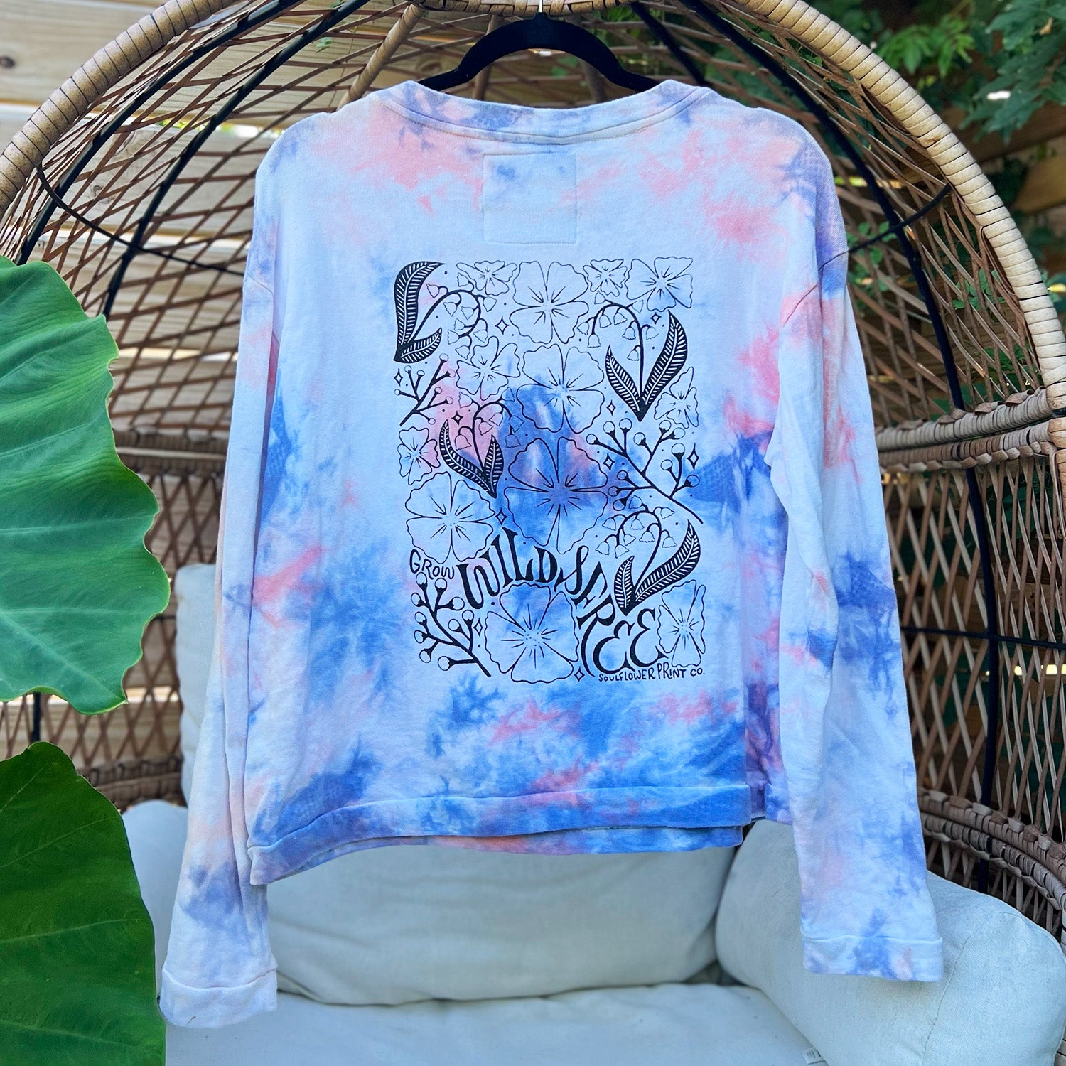 Embrace your wild side with our blue, pink and white tiedye long sleeve shirt featuring the "Grow Wild & Free" design. This soft, comfortable shirt is adorned with delicate lily of the valley, vibrant anemones, and clusters of berries, capturing the essence of nature's beauty. Perfect for anyone who loves to connect with nature, this shirt is your go-to for a casual day out or as a reminder to stay true to your wild, free spirit. One-color screenprint.
