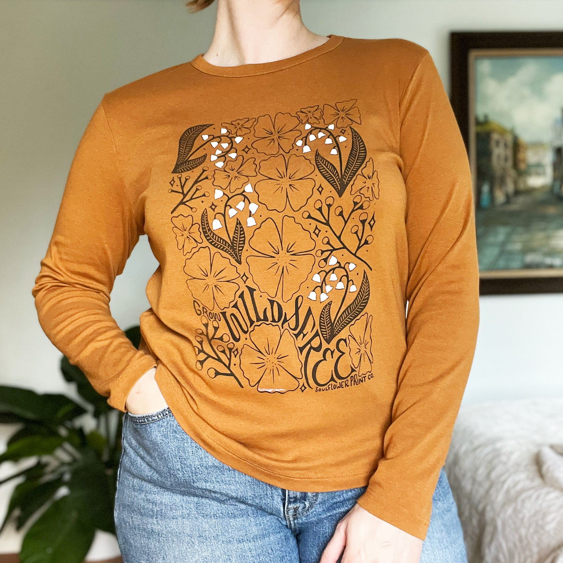 Embrace your wild side with this brown long sleeve shirt featuring the "Grow Wild & Free" design. This soft, comfortable shirt features a Soulflower illustration of lily of the valley, beautiful anemones, and clusters of berries, capturing the essence of nature's beauty. Perfect for anyone who loves to connect with nature, this shirt is your go-to for a casual day out or as a reminder to stay true to your wild, free spirit. Two-color screenprint.