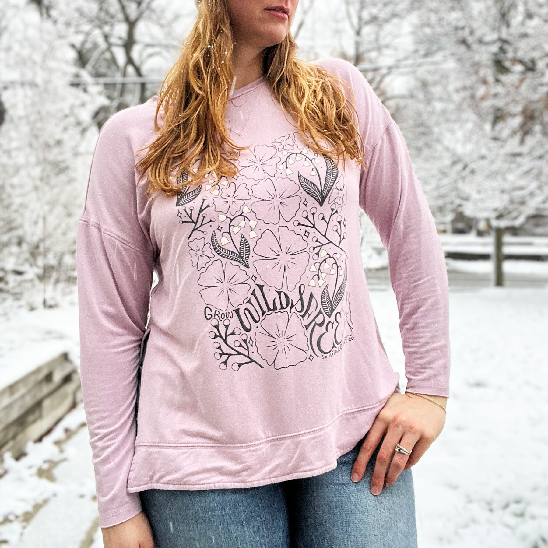 Embrace your wild side with our purple long sleeve shirt with hoodie featuring the "Grow Wild & Free" design. This soft, comfortable shirt features an illustration with lily of the valley, anemones, and clusters of berries, capturing the essence of nature's beauty. Perfect for anyone who loves to connect with nature, this shirt is your go-to for a casual day out or as a reminder to stay true to your wild, free spirit. Three-color screenprint featured on the front.