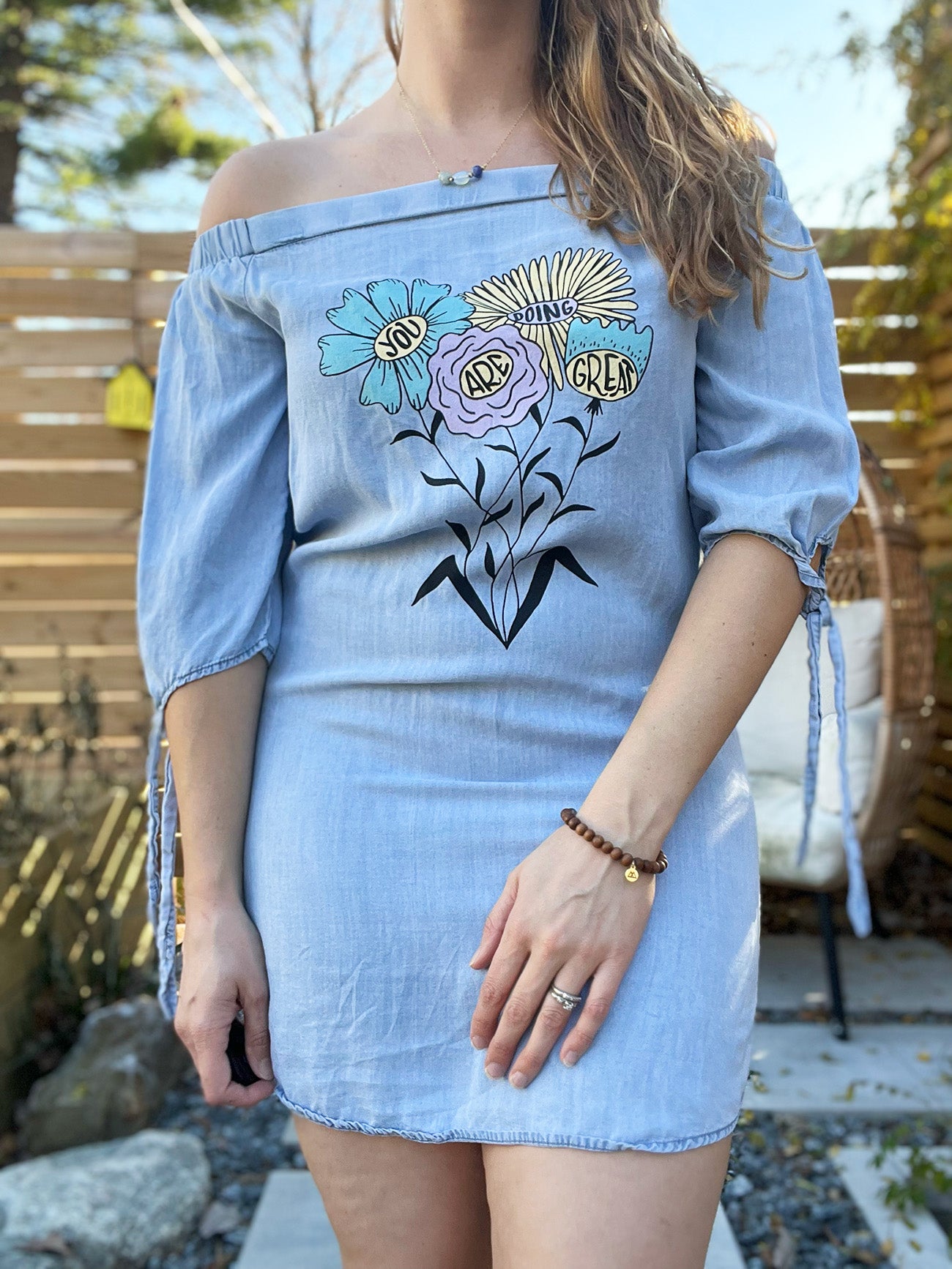 Blue / chambray dress with 3/4 sleeve off-the-shoulder look. Front featuring You Are Doing Great flower bouquet design. Back of the dress is blank. 4-color screenprint featured on the front of the dress.